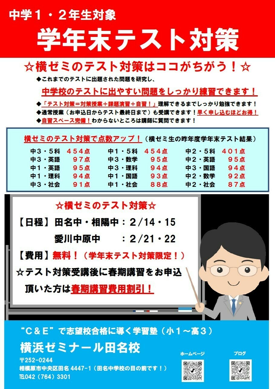 愛川中原中1・2年生は2/21(土)・22(日)で「学年末テスト対策」を実施いたします。